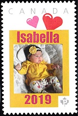 Isabella Born 2019 with stamp being designed by pkstampdesigns@gmail.com in 2020